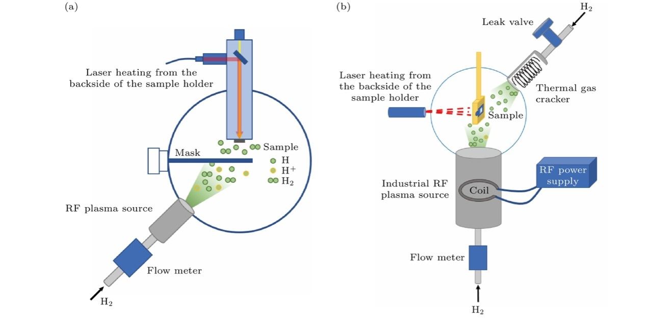 图2 原位原子氢还原装置示意图 (a) 集成在PLD腔体的科研用射频等离子体源示意图; (b) 集成在另一套腔体的工业用等离子体源和热裂解源示意图