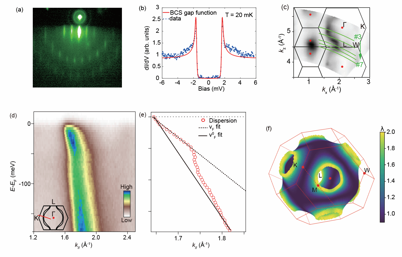 图 4 LiTi₂O₄ 的薄膜质量、超导能隙、能带重整化及三维 EPC 各向异性。(a) RHEED 图样呈现清晰条纹和高阶衍射点,表明 LiTi₂O₄ 外延薄膜具有高质量和平整表面。(b) 20 mK 下的 STS 谱显示 U 型无节点超导能隙,符合 s-wave BCS 超导特征。(c) ARPES 能带色散呈现约 45 meV 的 kink 结构,反映显著的电子–声子耦合。(d) kₓ–k_z 平面费米面周期性(Fig.3e)展示材料本征的三维费米面拓扑。(e) EPC 强度 λ 在三维费米面上呈强烈各向异性,在接近 L 点(鞍点位置)处最强,体现几何挫折与鞍点态对 EPC 的放大作用。